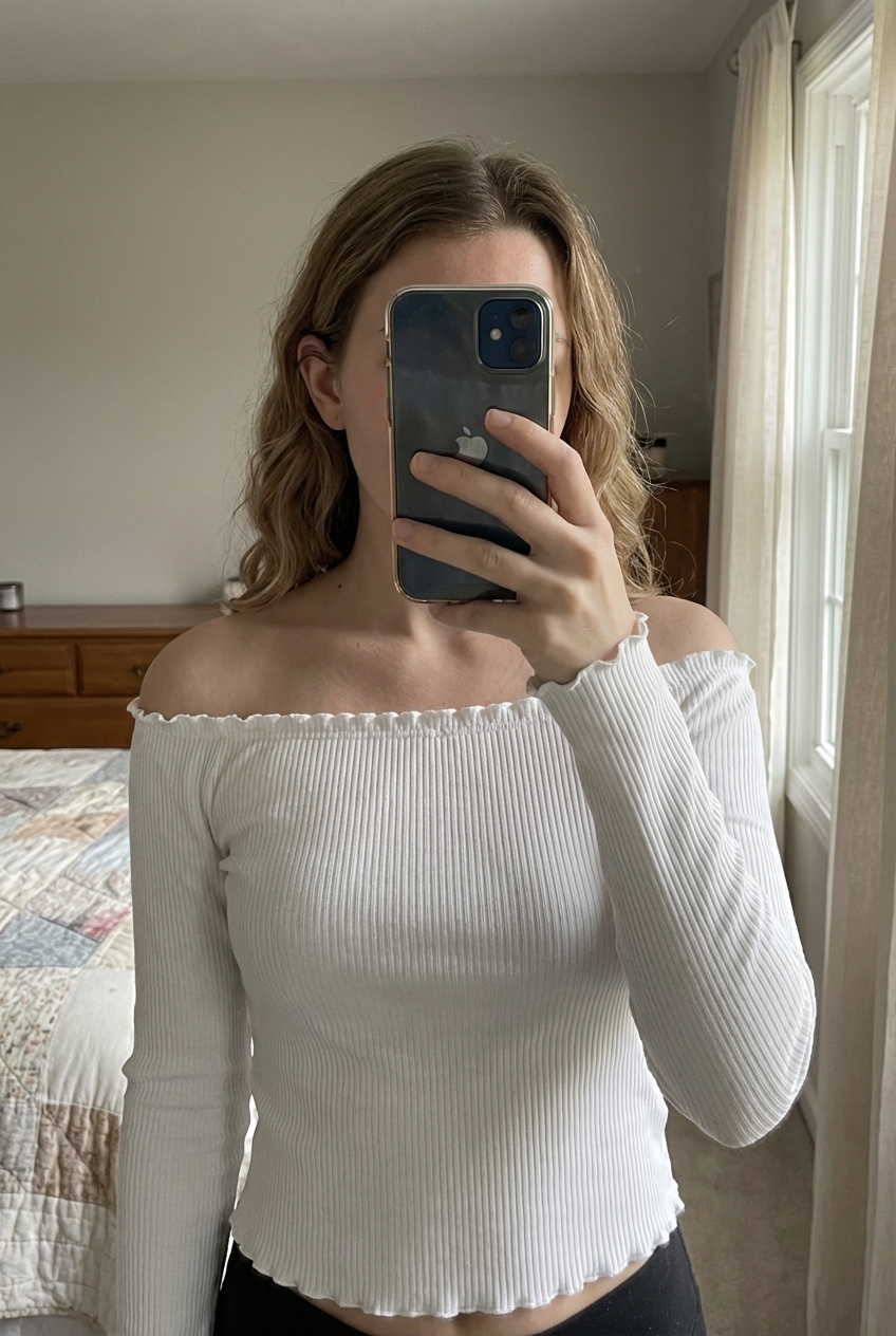 váll nélküli hosszujjú standing straight facing the camera, in a softly lit bedroom setting, with gentle natural light filtering through a window.