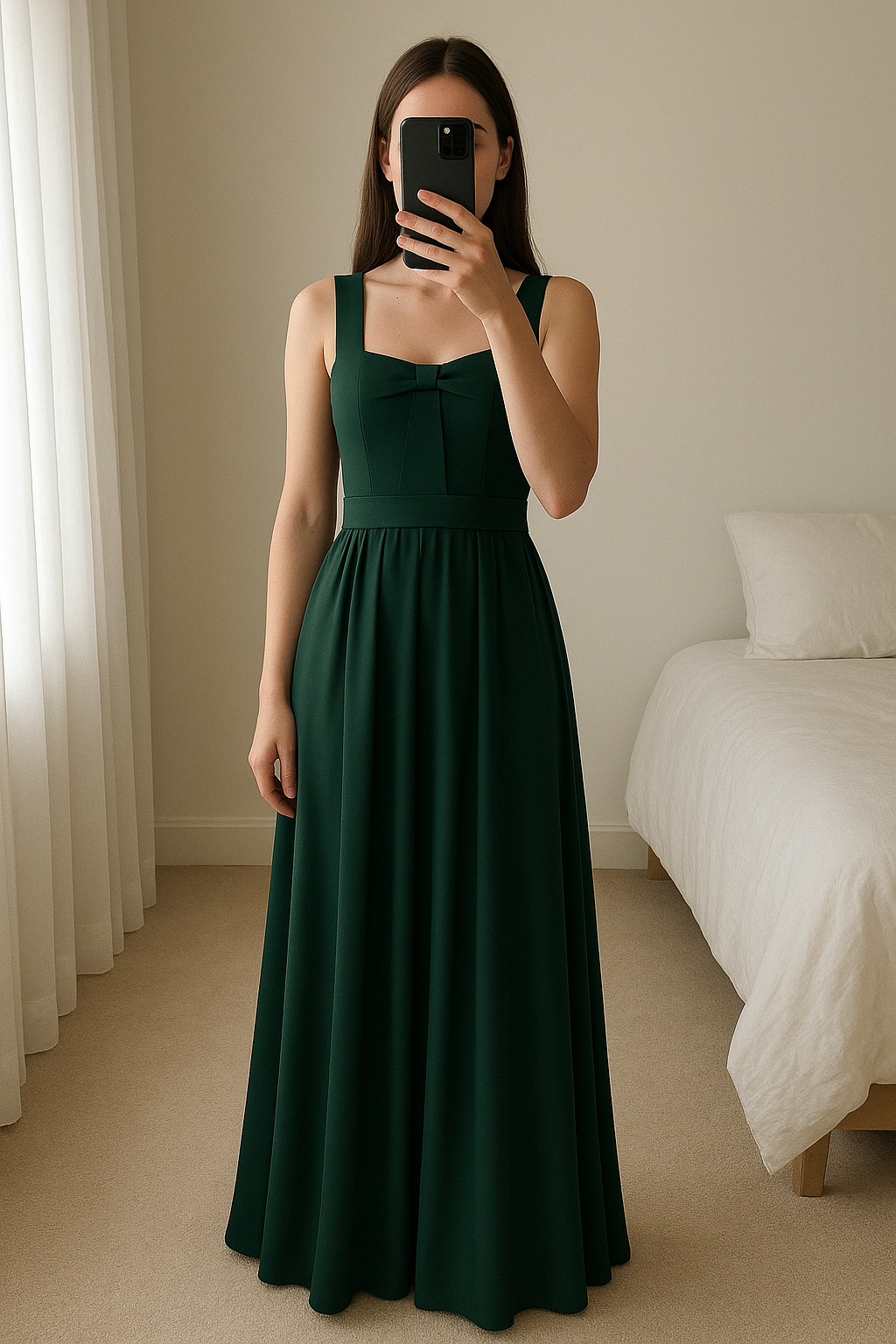 Vera Wang High-Neck Crepe Halter Bridesmaid Gown with Sash | WHITE by Vera Wang bridesmaid dress standing straight facing the camera, in a softly lit bedroom setting, with gentle natural light filtering through a window.
