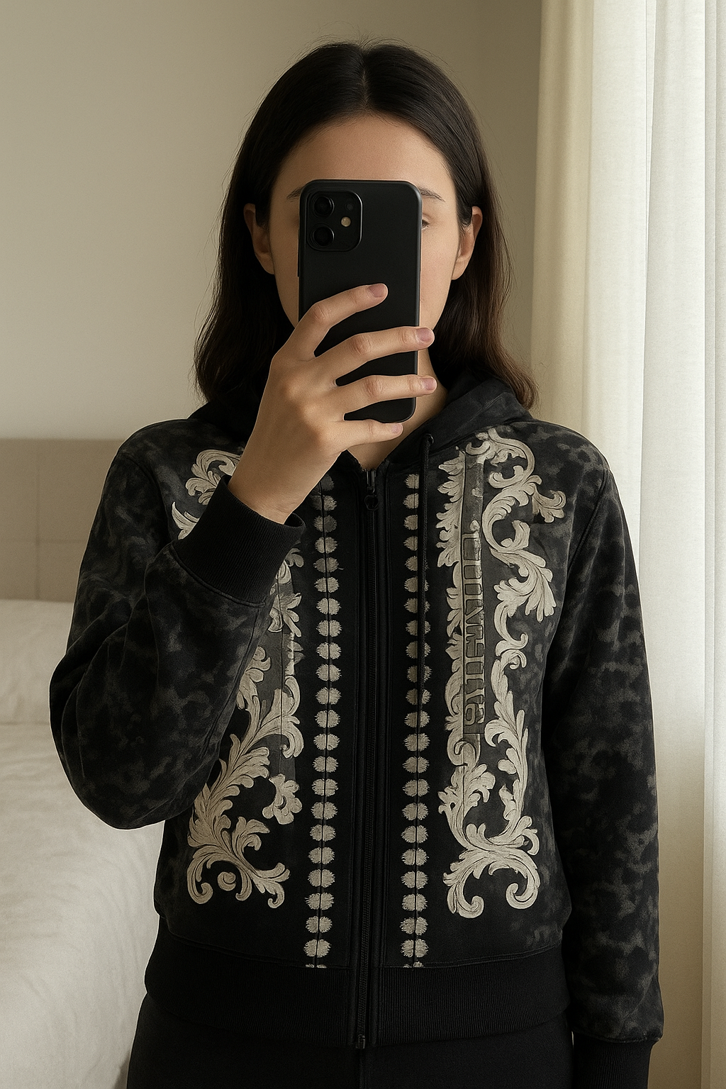 Versace Jeans Couture BAROC - Sweat zippé - black debout, face à la caméra, dans une chambre à la lumière douce, avec une lumière naturelle filtrant par la fenêtre.