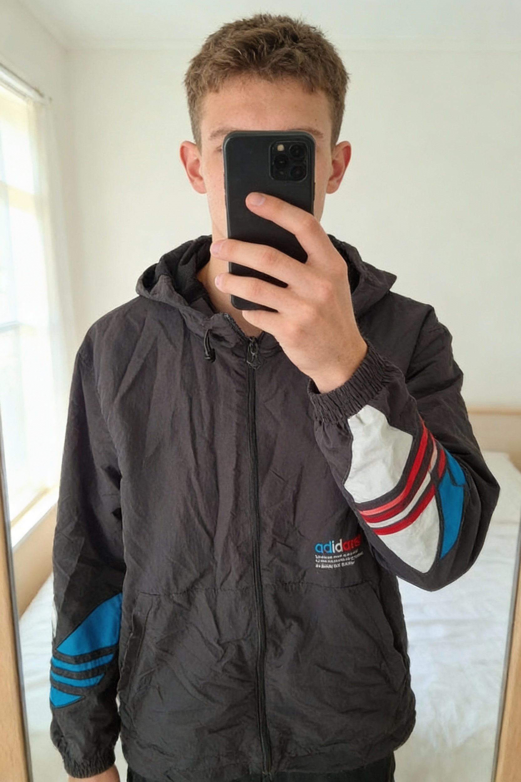Veste Adidas debout, face à la caméra, dans une chambre à la lumière douce, avec une lumière naturelle filtrant par la fenêtre.
