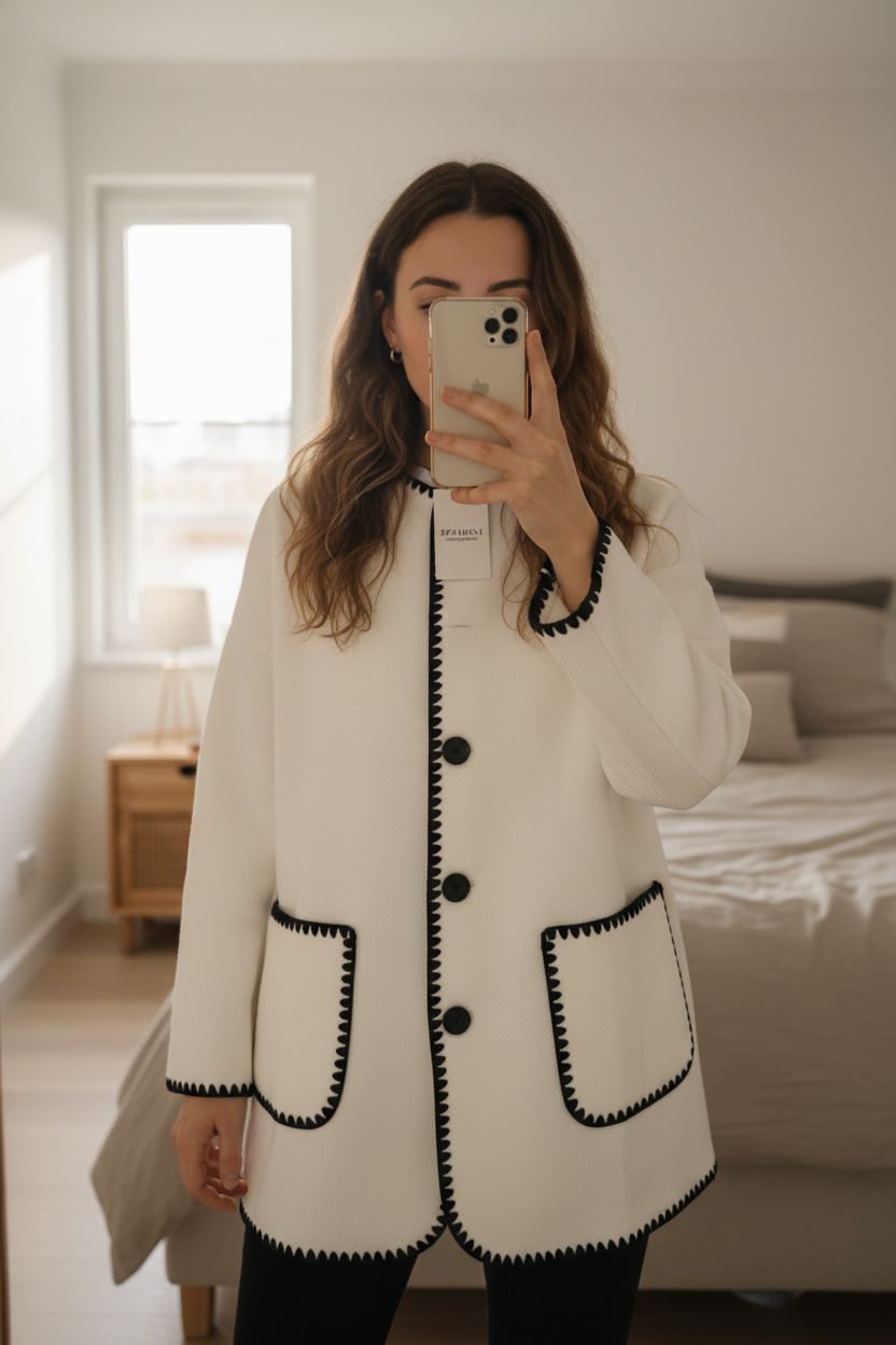 Veste blanche un peu polaire taille 38 jamais porté debout, face à la caméra, dans une chambre à la lumière douce, avec une lumière naturelle filtrant par la fenêtre.