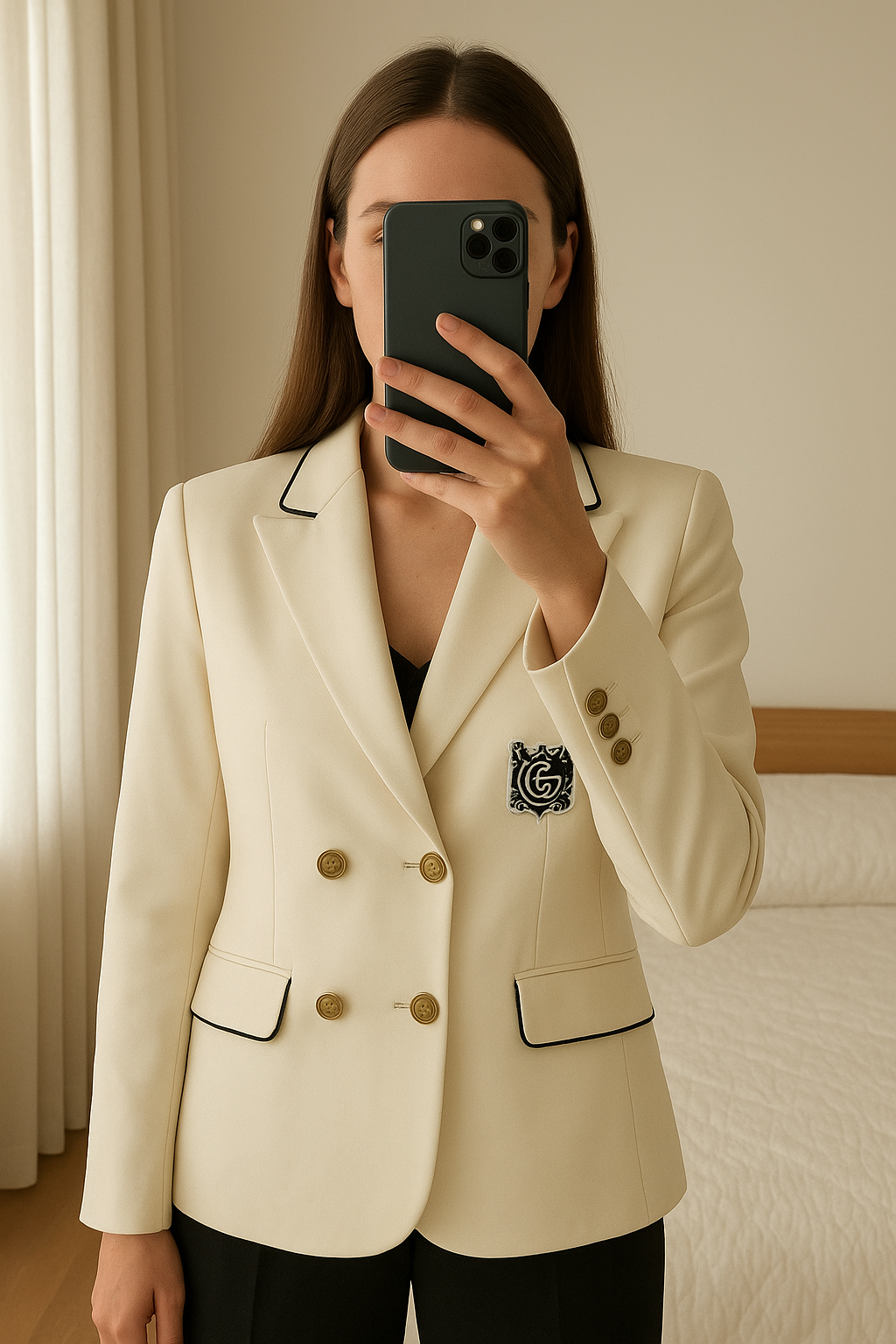 Veste blazer blanc taille 36 Gucci debout, face à la caméra, dans une chambre à la lumière douce, avec une lumière naturelle filtrant par la fenêtre.