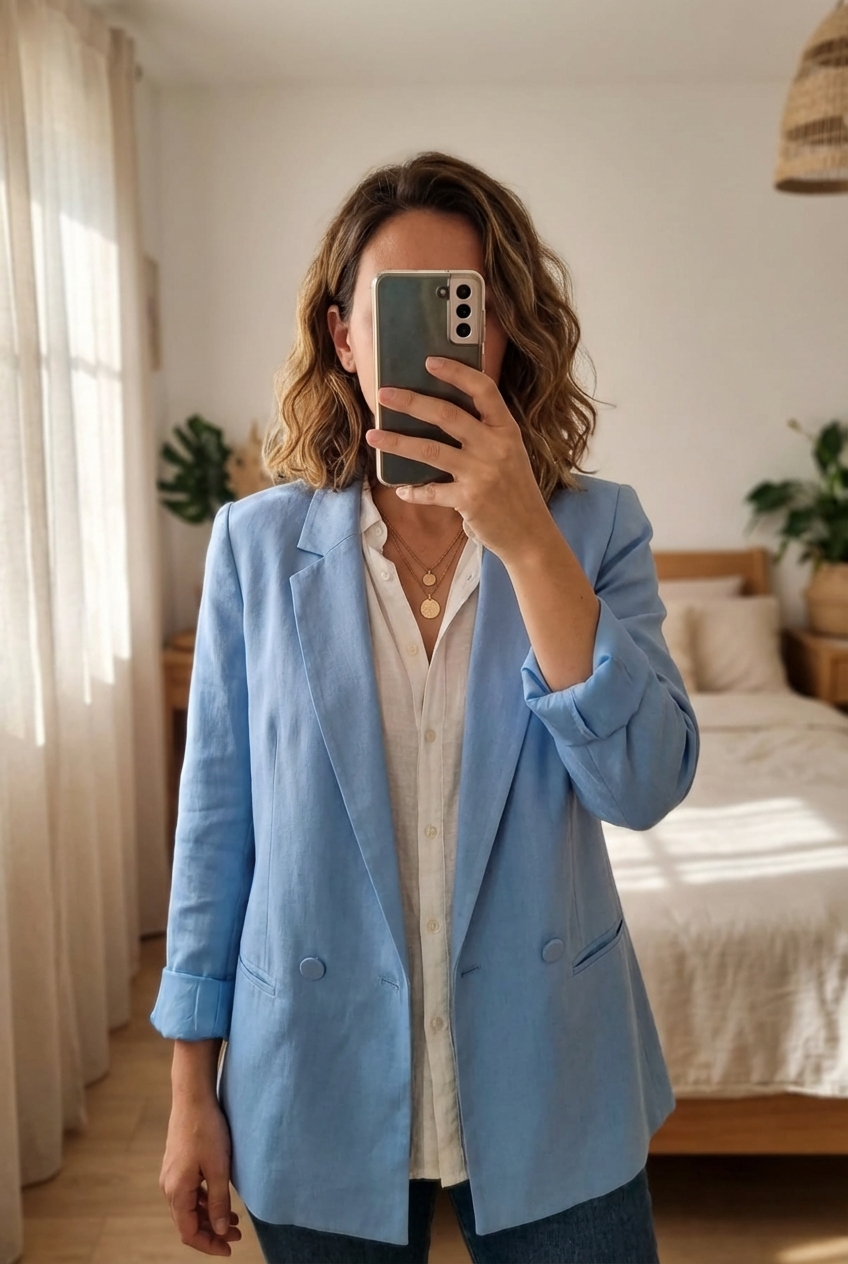 Une personne en Veste blazer bleu Camaïeu debout, face à la caméra, dans une chambre à la lumière douce, avec une lumière naturelle filtrant par la fenêtre.