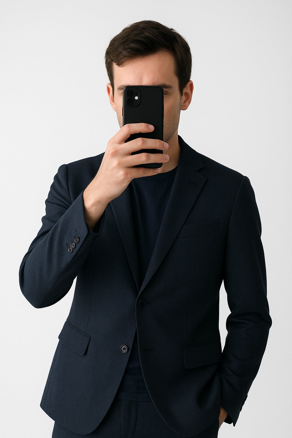 Une personne en Veste blazer homme Burton 50 cambrant légèrement le dos pour une pose dynamique, dans un studio photo épuré avec fond blanc et éclairage doux.