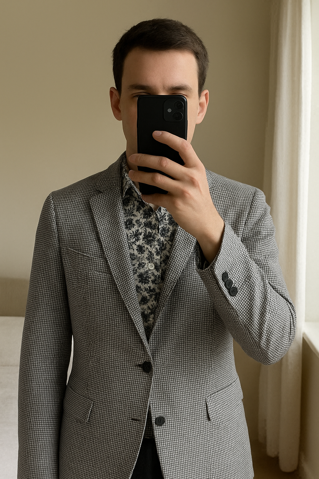 Veste blazer zara taille 52 debout, face à la caméra, dans une chambre à la lumière douce, avec une lumière naturelle filtrant par la fenêtre.