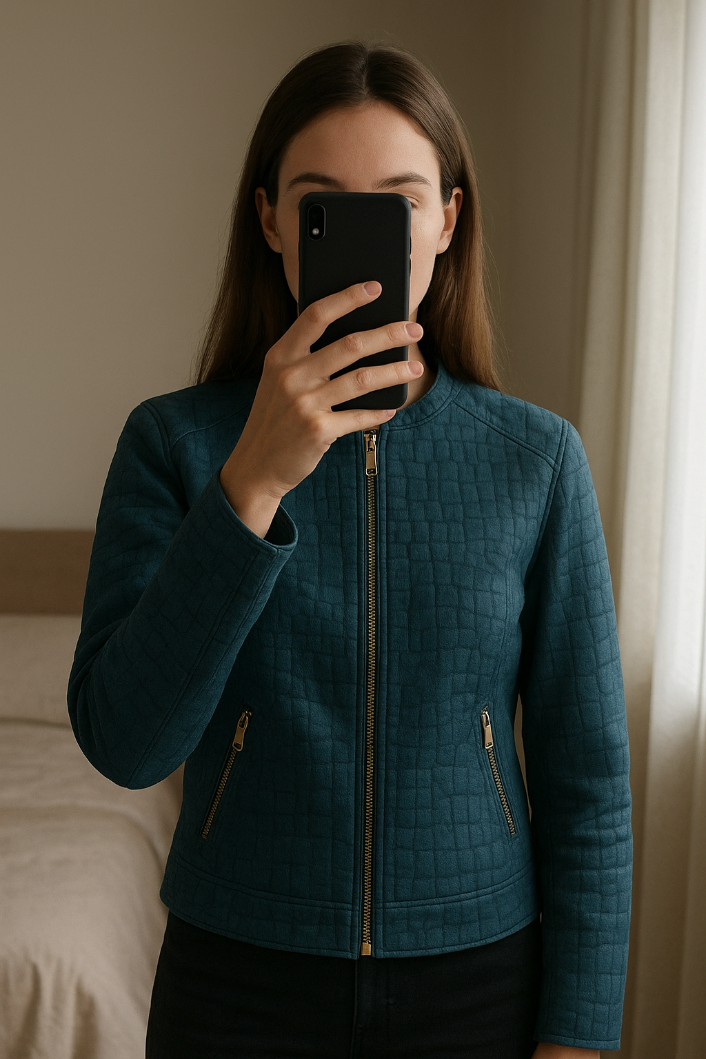 Veste bleu effet croco zippée – Taille M Marque Maison blue Deise debout, face à la caméra, dans une chambre à la lumière douce, avec une lumière naturelle filtrant par la fenêtre.