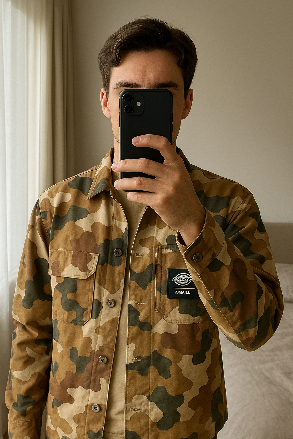 Veste camouflage Dickies debout, face à la caméra, dans une chambre à la lumière douce, avec une lumière naturelle filtrant par la fenêtre.