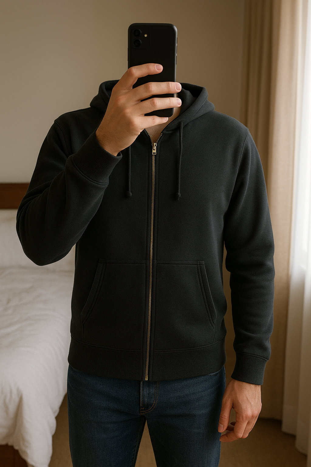 Veste à capuche debout, face à la caméra, dans une chambre à la lumière douce, avec une lumière naturelle filtrant par la fenêtre.