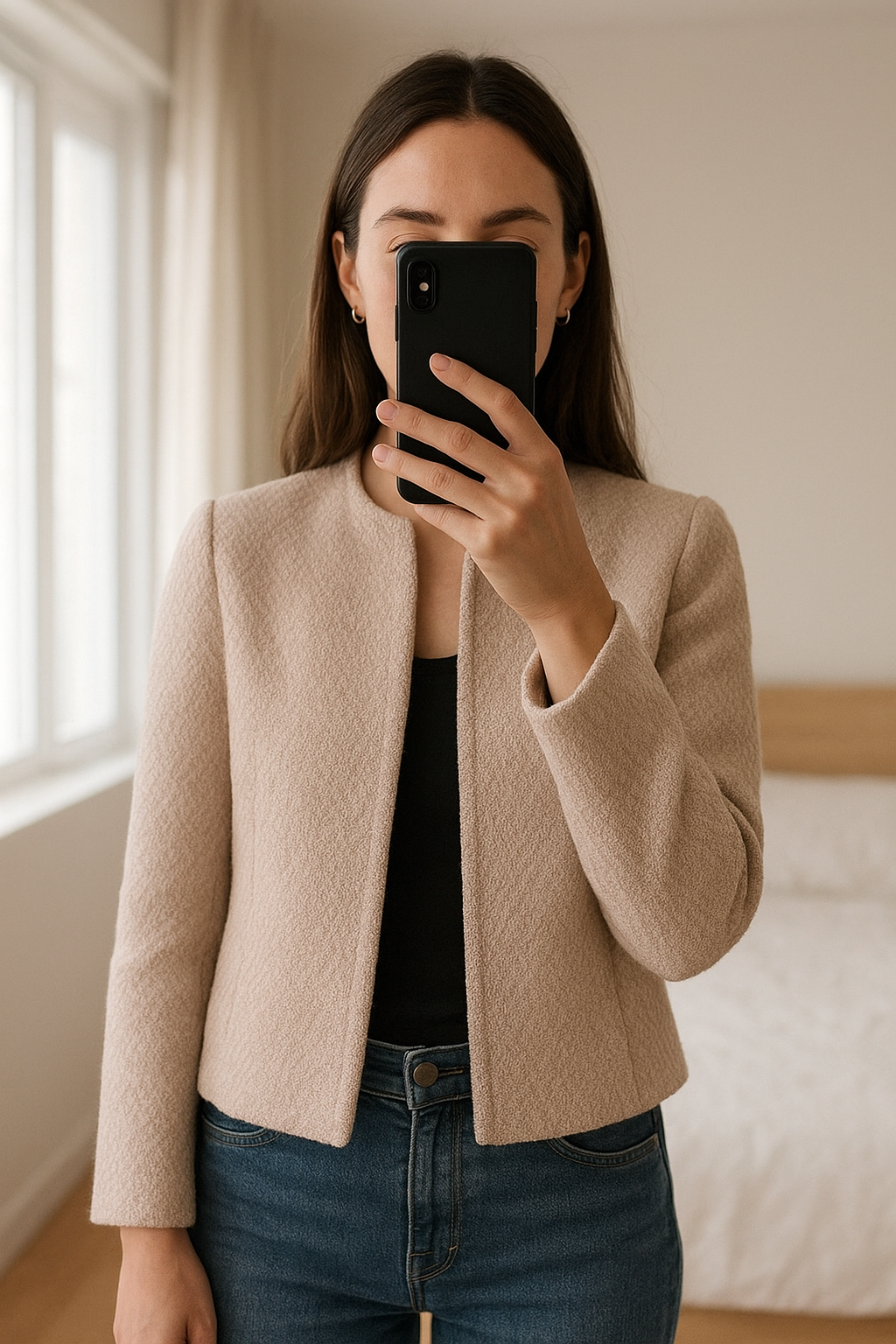 Veste Caroll taille 40 debout, face à la caméra, dans une chambre à la lumière douce, avec une lumière naturelle filtrant par la fenêtre.