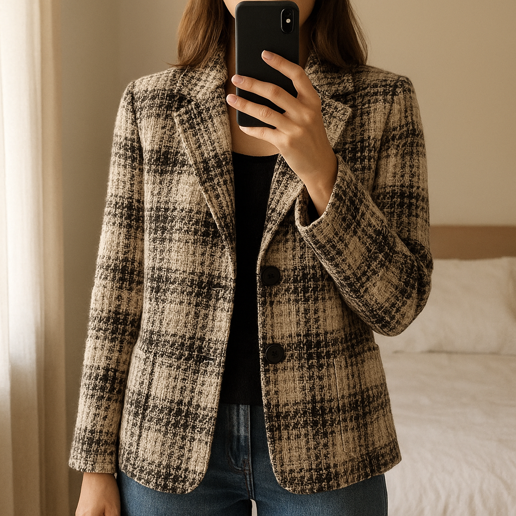 Veste à carreaux de taille 36 cache cache debout, face à la caméra, dans une chambre à la lumière douce, avec une lumière naturelle filtrant par la fenêtre.