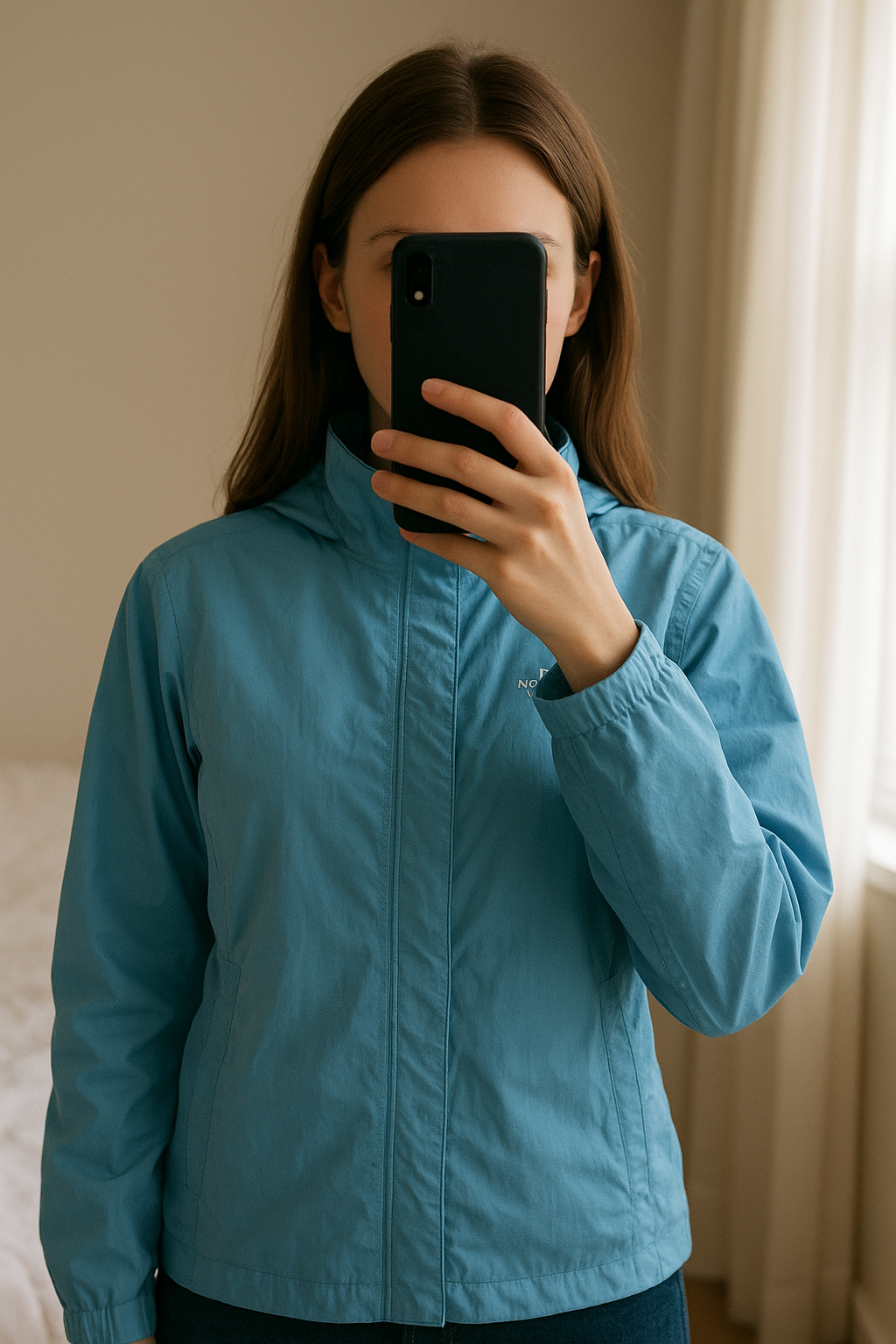 Veste coupe-vent The North face debout, face à la caméra, dans une chambre à la lumière douce, avec une lumière naturelle filtrant par la fenêtre.