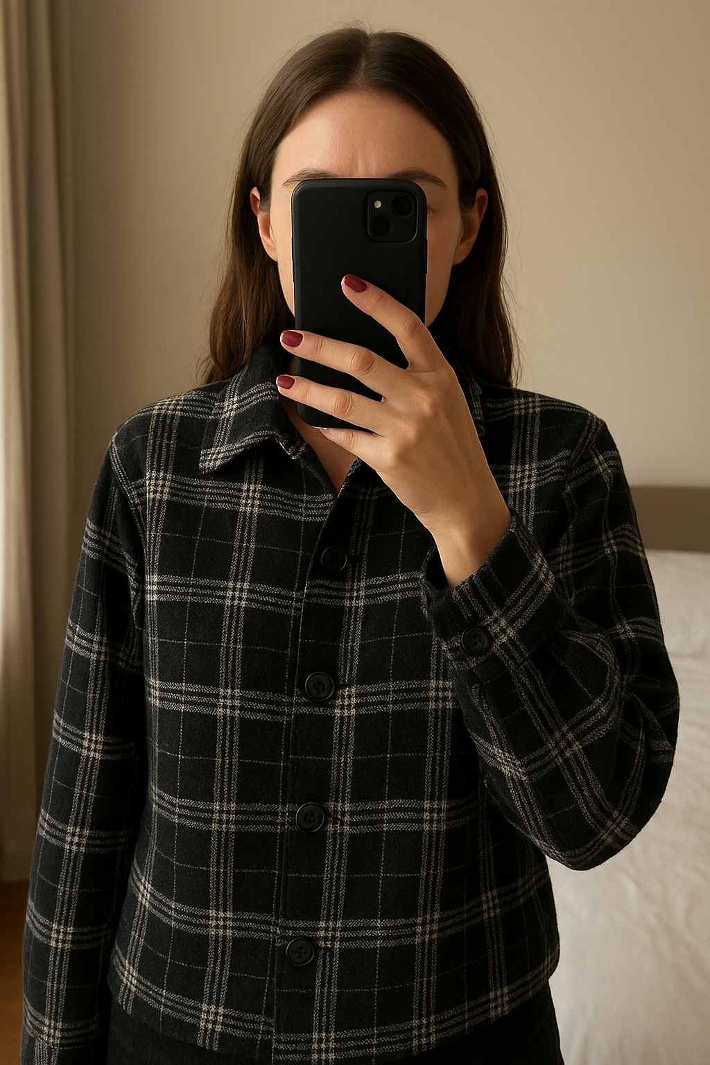 Veste courte debout, face à la caméra, dans une chambre à la lumière douce, avec une lumière naturelle filtrant par la fenêtre.