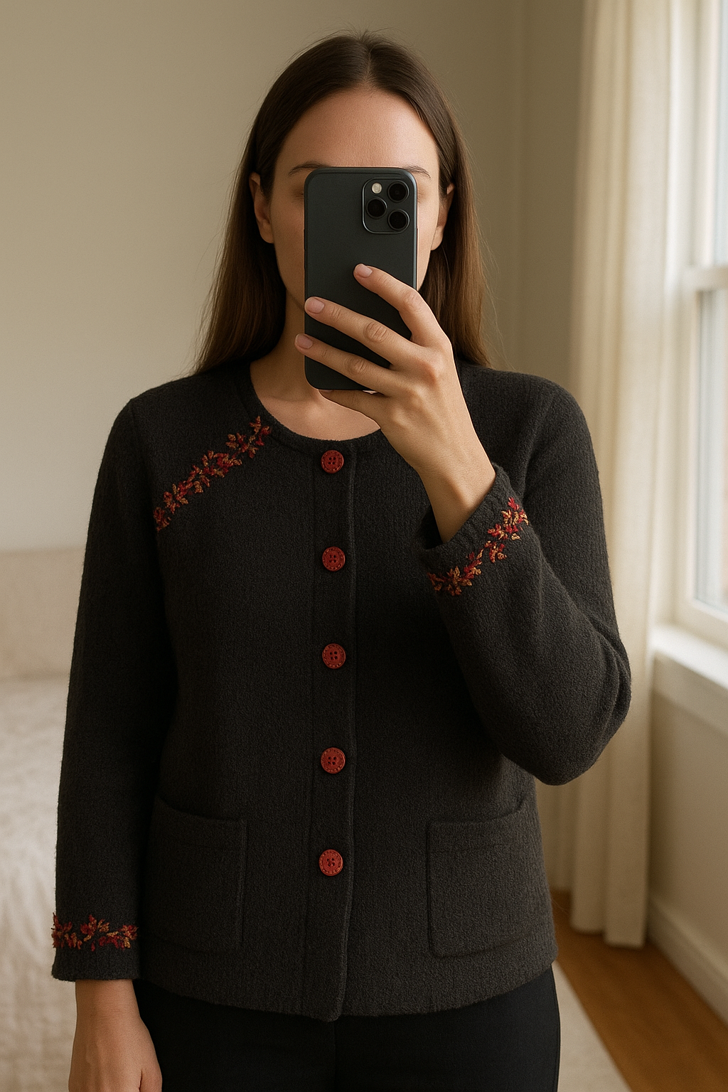 Veste d’hiver chic debout, face à la caméra, dans une chambre à la lumière douce, avec une lumière naturelle filtrant par la fenêtre.