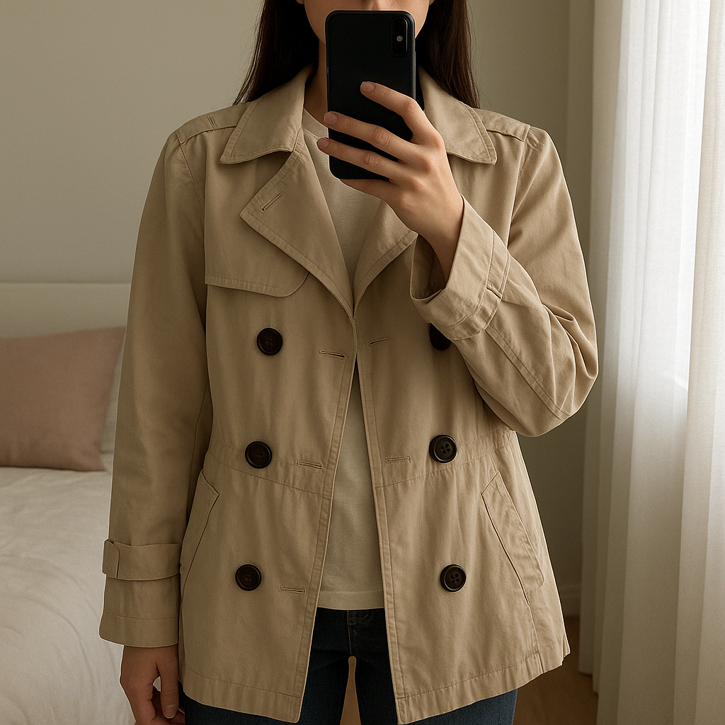Veste d’été debout, face à la caméra, dans une chambre à la lumière douce, avec une lumière naturelle filtrant par la fenêtre.