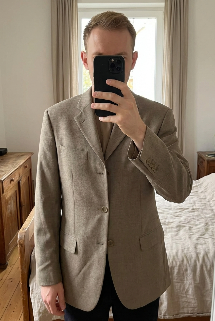 Veste de costume debout, face à la caméra, dans une chambre à la lumière douce, avec une lumière naturelle filtrant par la fenêtre.