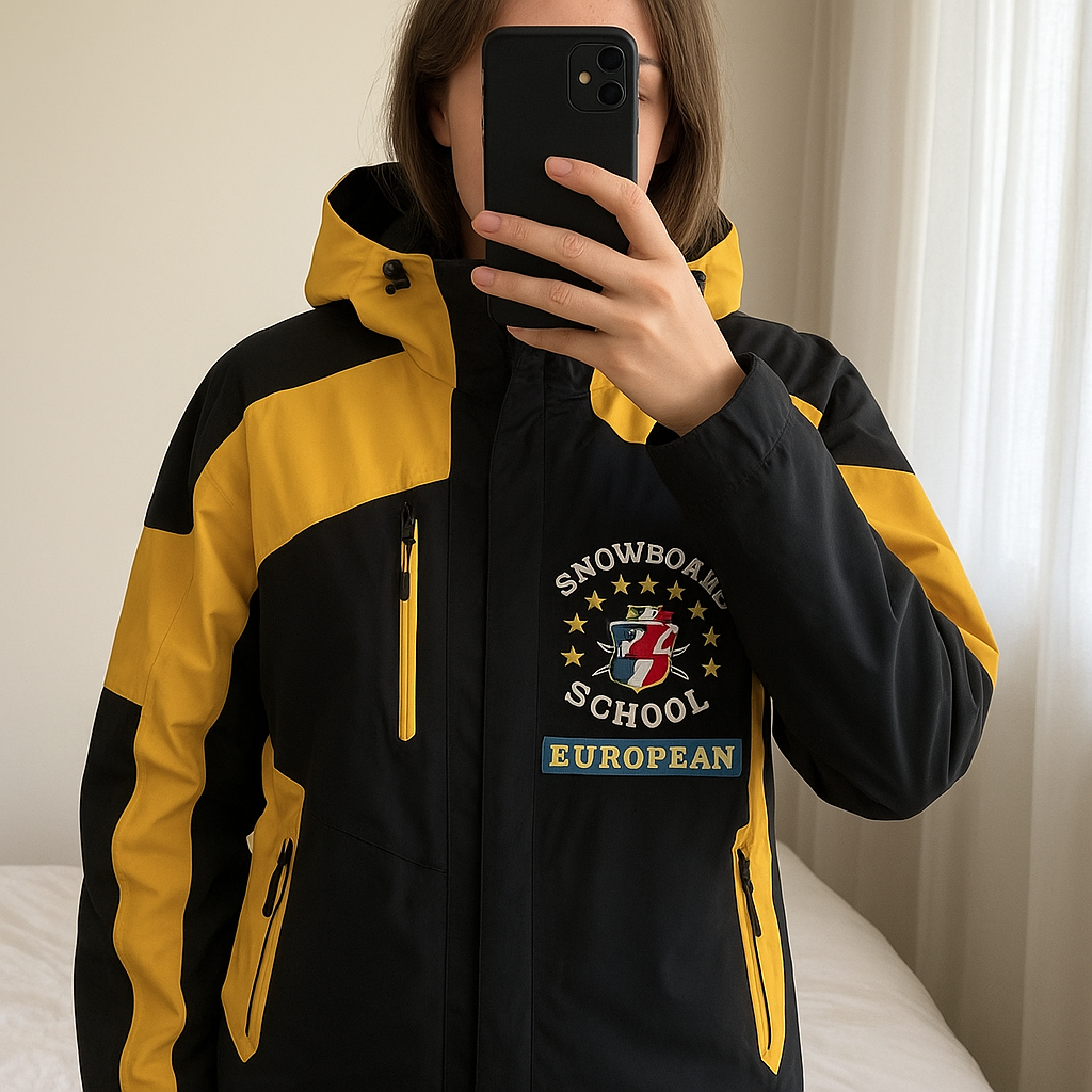 Veste de ski Sun Valley Gore Tex taille S debout, face à la caméra, dans une chambre à la lumière douce, avec une lumière naturelle filtrant par la fenêtre.