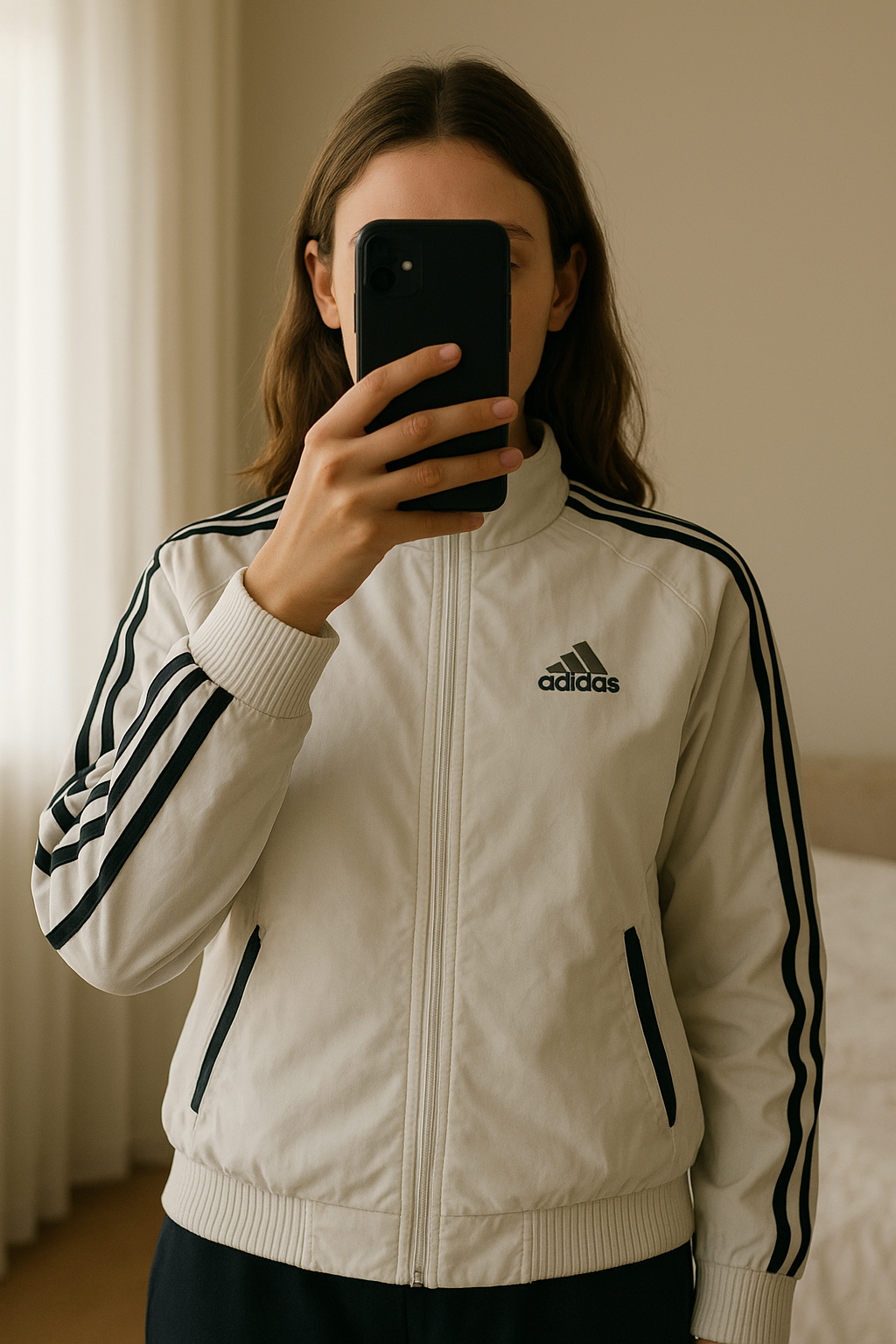 Veste de survêtement Adidas blanche 🧥 debout, face à la caméra, dans une chambre à la lumière douce, avec une lumière naturelle filtrant par la fenêtre.