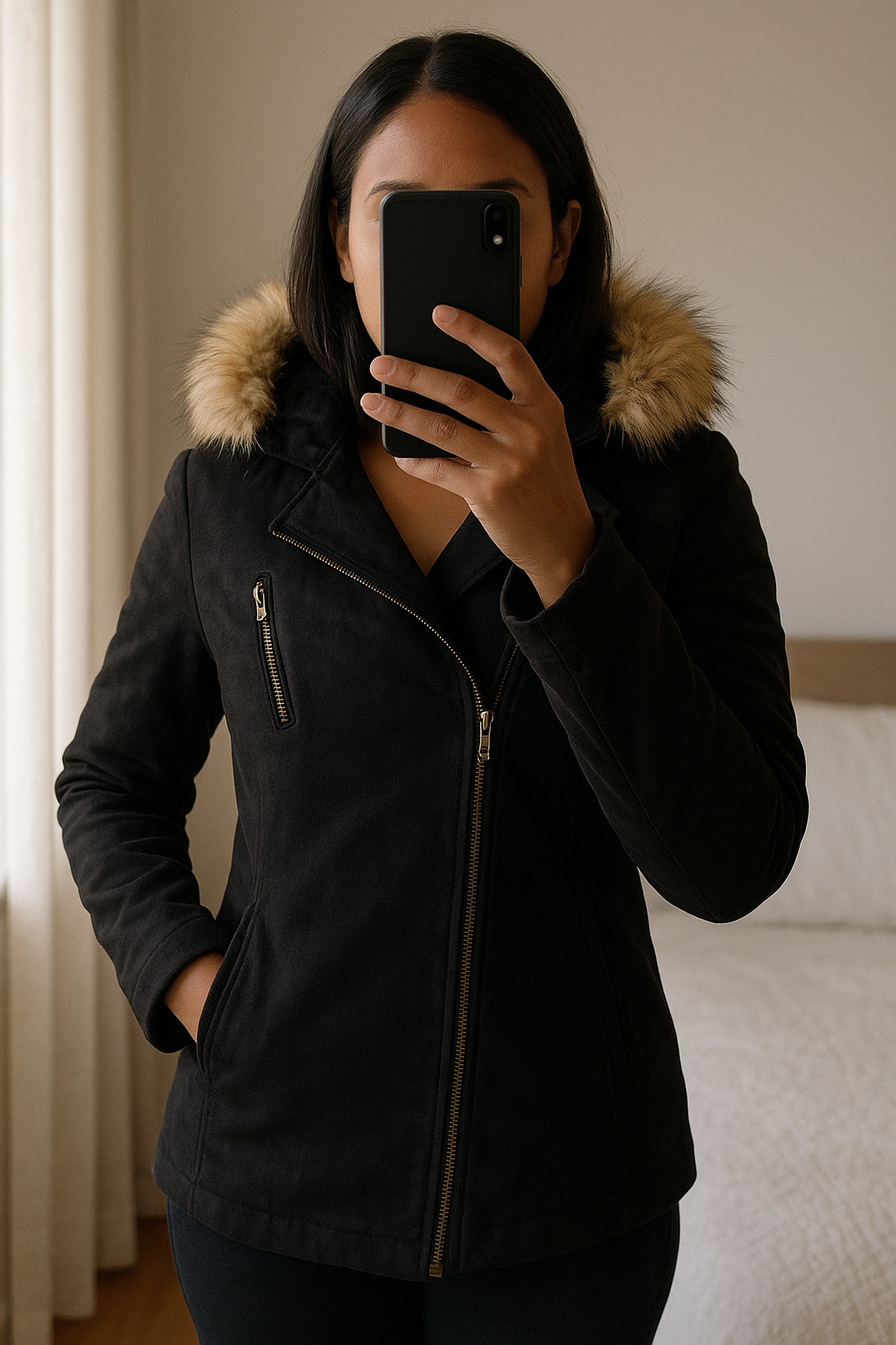 Veste en cuir véritable à vendre debout, face à la caméra, dans une chambre à la lumière douce, avec une lumière naturelle filtrant par la fenêtre.