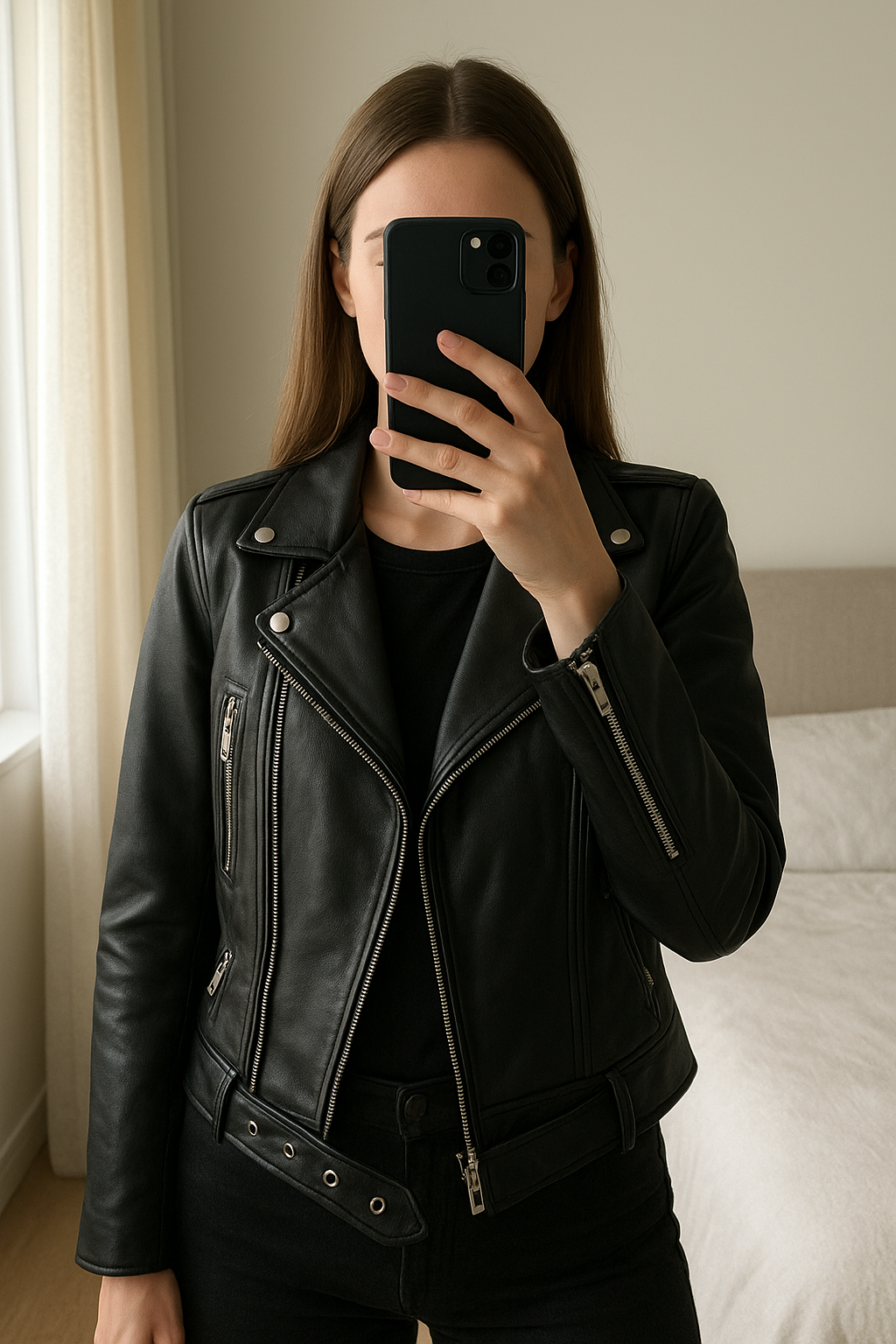 Veste en cuir Zara debout, face à la caméra, dans une chambre à la lumière douce, avec une lumière naturelle filtrant par la fenêtre.