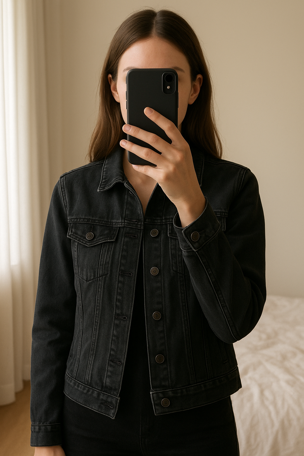 veste en jean debout, face à la caméra, dans une chambre à la lumière douce, avec une lumière naturelle filtrant par la fenêtre.