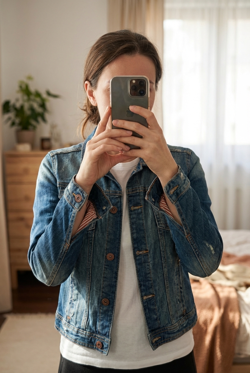 Veste en jean debout, face à la caméra, dans une chambre à la lumière douce, avec une lumière naturelle filtrant par la fenêtre.
