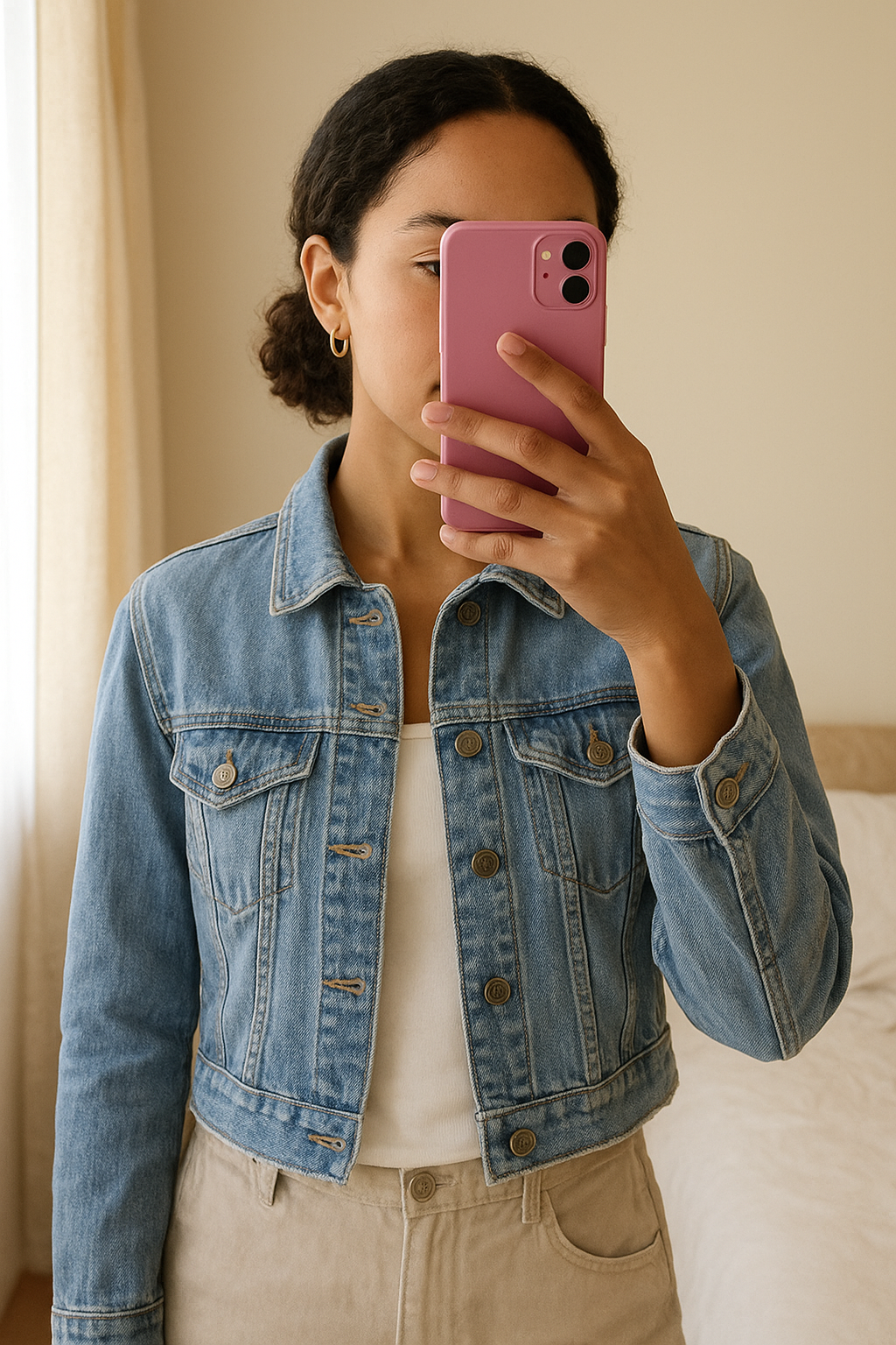 Veste en jean courte debout, face à la caméra, dans une chambre à la lumière douce, avec une lumière naturelle filtrant par la fenêtre.