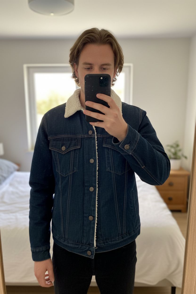 Veste en jeans - Pépé jeans - bleu - TS debout, face à la caméra, dans une chambre à la lumière douce, avec une lumière naturelle filtrant par la fenêtre.