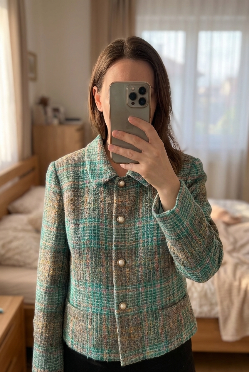 Veste en tweed Vintage debout, face à la caméra, dans une chambre à la lumière douce, avec une lumière naturelle filtrant par la fenêtre.