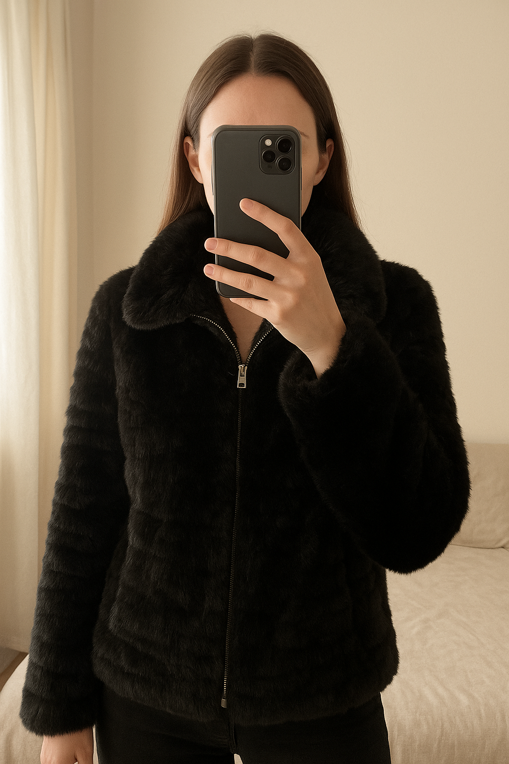 Veste fausse fourrure noire Christine Laure debout, face à la caméra, dans une chambre à la lumière douce, avec une lumière naturelle filtrant par la fenêtre.