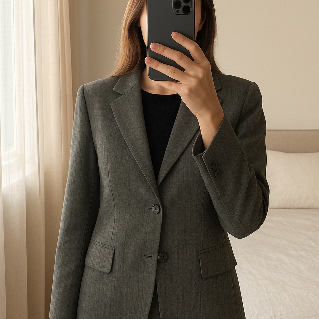 Veste grise Antonelle – Taille 42 – Très bon état debout, face à la caméra, dans une chambre à la lumière douce, avec une lumière naturelle filtrant par la fenêtre.