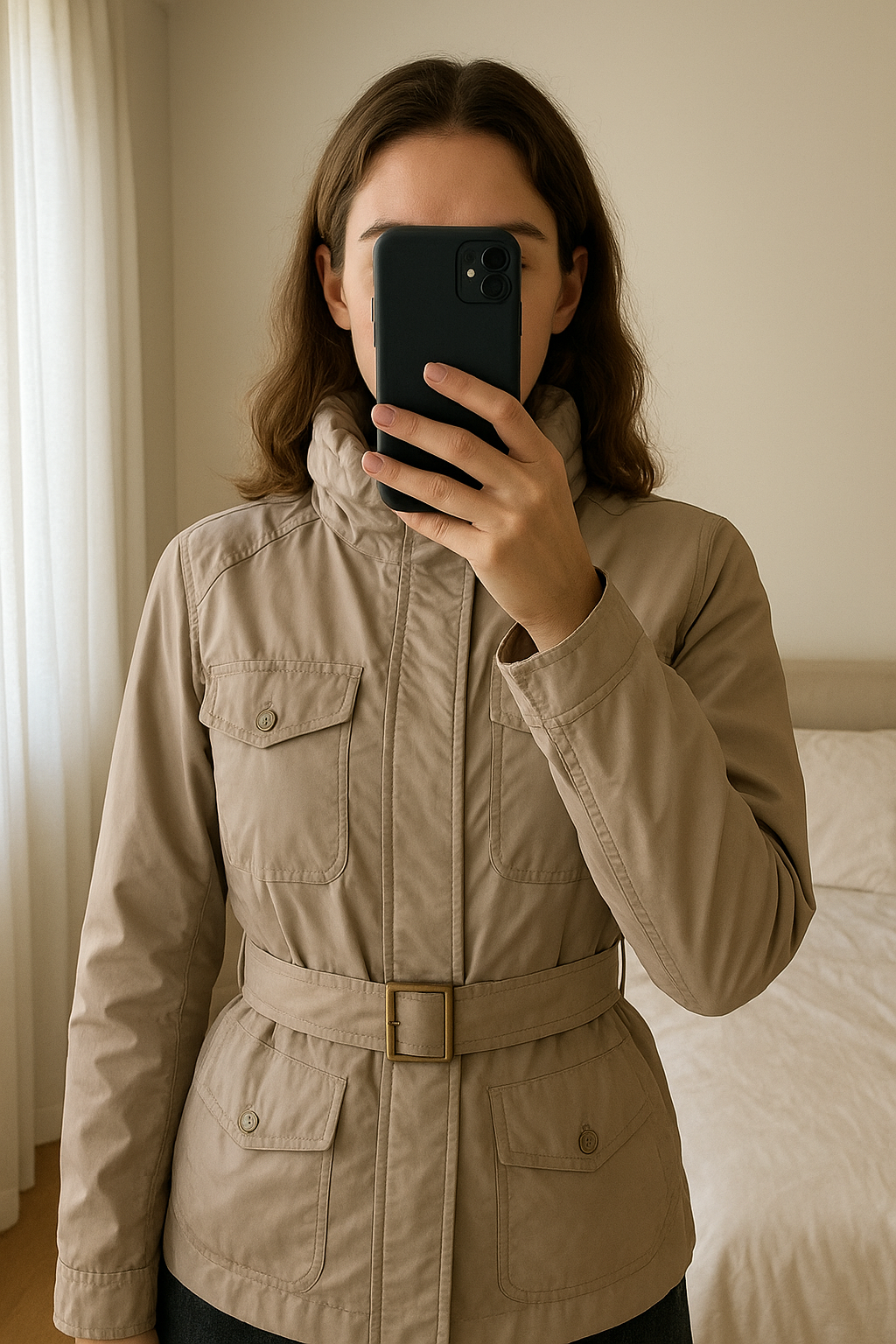Veste Guess debout, face à la caméra, dans une chambre à la lumière douce, avec une lumière naturelle filtrant par la fenêtre.