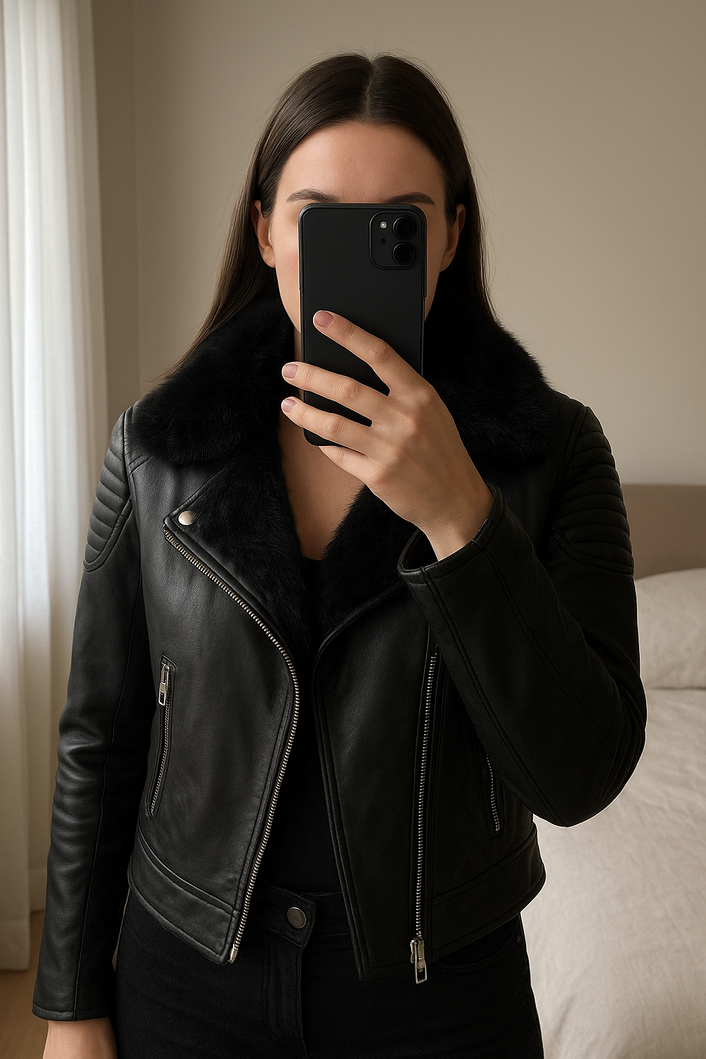 Veste guess debout, face à la caméra, dans une chambre à la lumière douce, avec une lumière naturelle filtrant par la fenêtre.