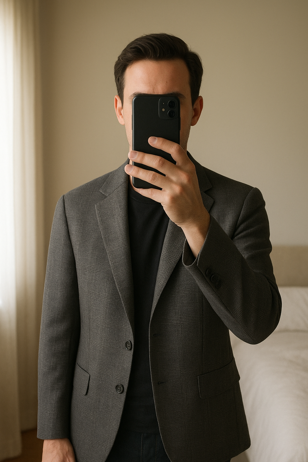 Veste homme Mango aufrecht stehend, der Kamera zugewandt, in einem sanft beleuchteten Schlafzimmer, mit natürlichem Licht, das durch ein Fenster fällt.