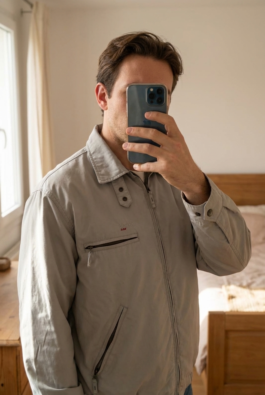 Veste homme Schott L gris clair - Très bon état debout, face à la caméra, dans une chambre à la lumière douce, avec une lumière naturelle filtrant par la fenêtre.