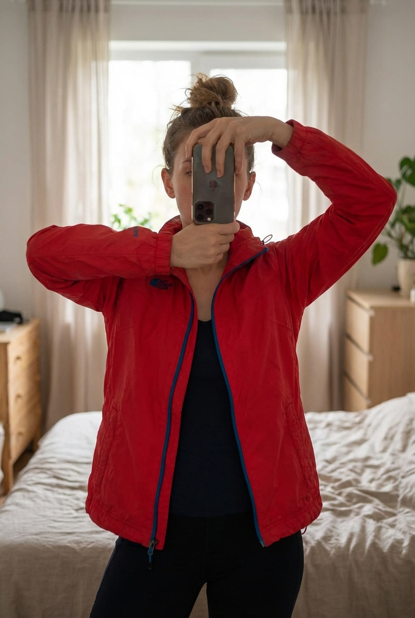 Veste HyVent Imperméable Nylon Jacket The North Face Rose XS debout, face à la caméra, dans une chambre à la lumière douce, avec une lumière naturelle filtrant par la fenêtre.