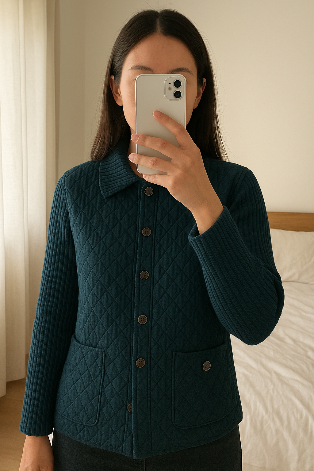 Veste jean blue willi's taille S debout, face à la caméra, dans une chambre à la lumière douce, avec une lumière naturelle filtrant par la fenêtre.