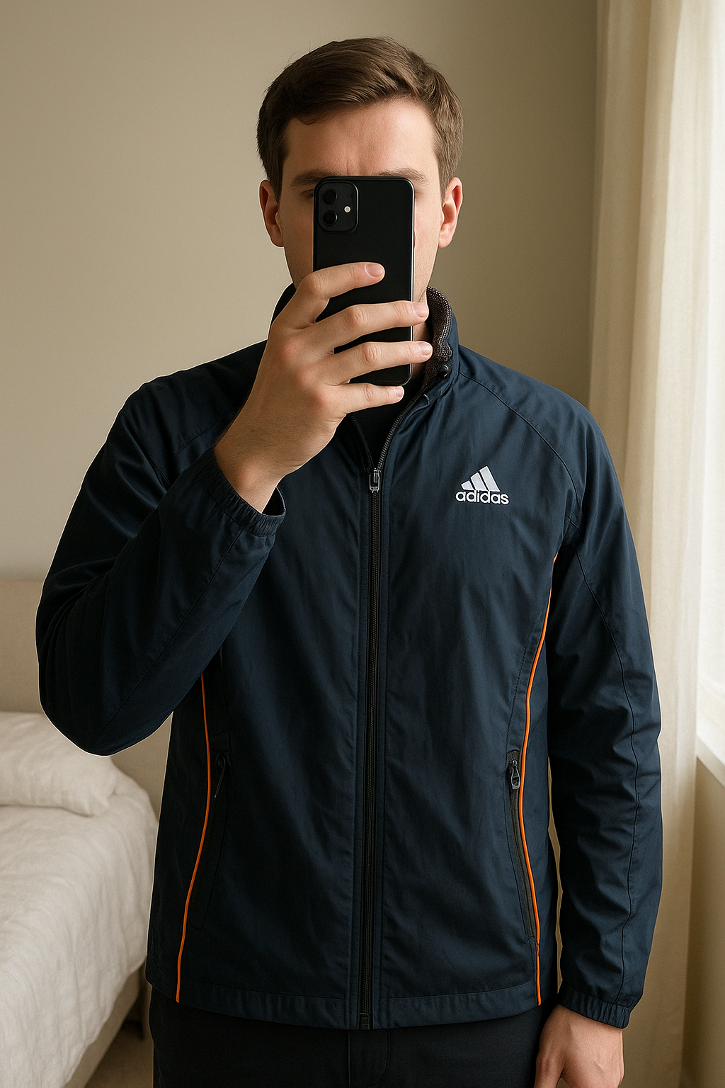 Veste légère adidas sport -running debout, face à la caméra, dans une chambre à la lumière douce, avec une lumière naturelle filtrant par la fenêtre.