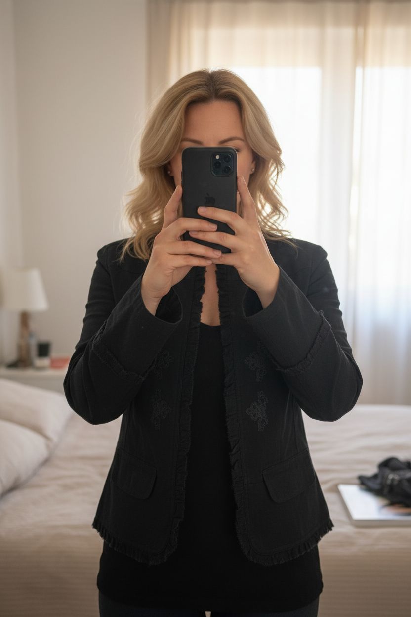 Une personne en Veste légère femme debout, face à la caméra, avec une silhouette légèrement plus ronde, dans une chambre à la lumière douce, avec une lumière naturelle filtrant par la fenêtre.