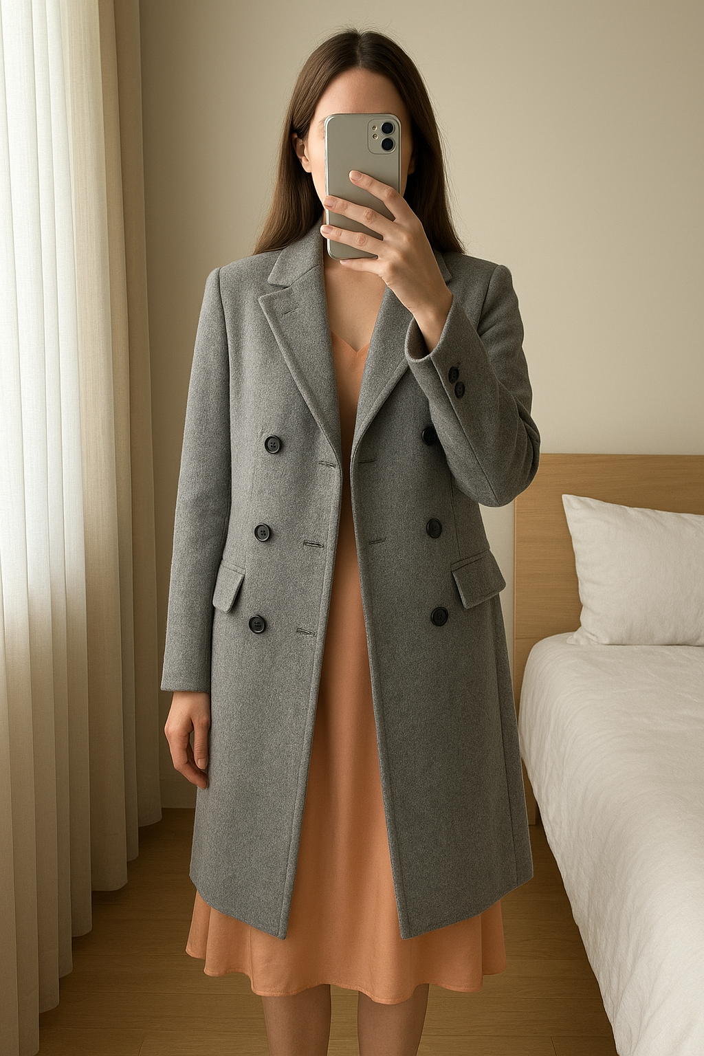 veste longue Pablo debout, face à la caméra, dans une chambre à la lumière douce, avec une lumière naturelle filtrant par la fenêtre.