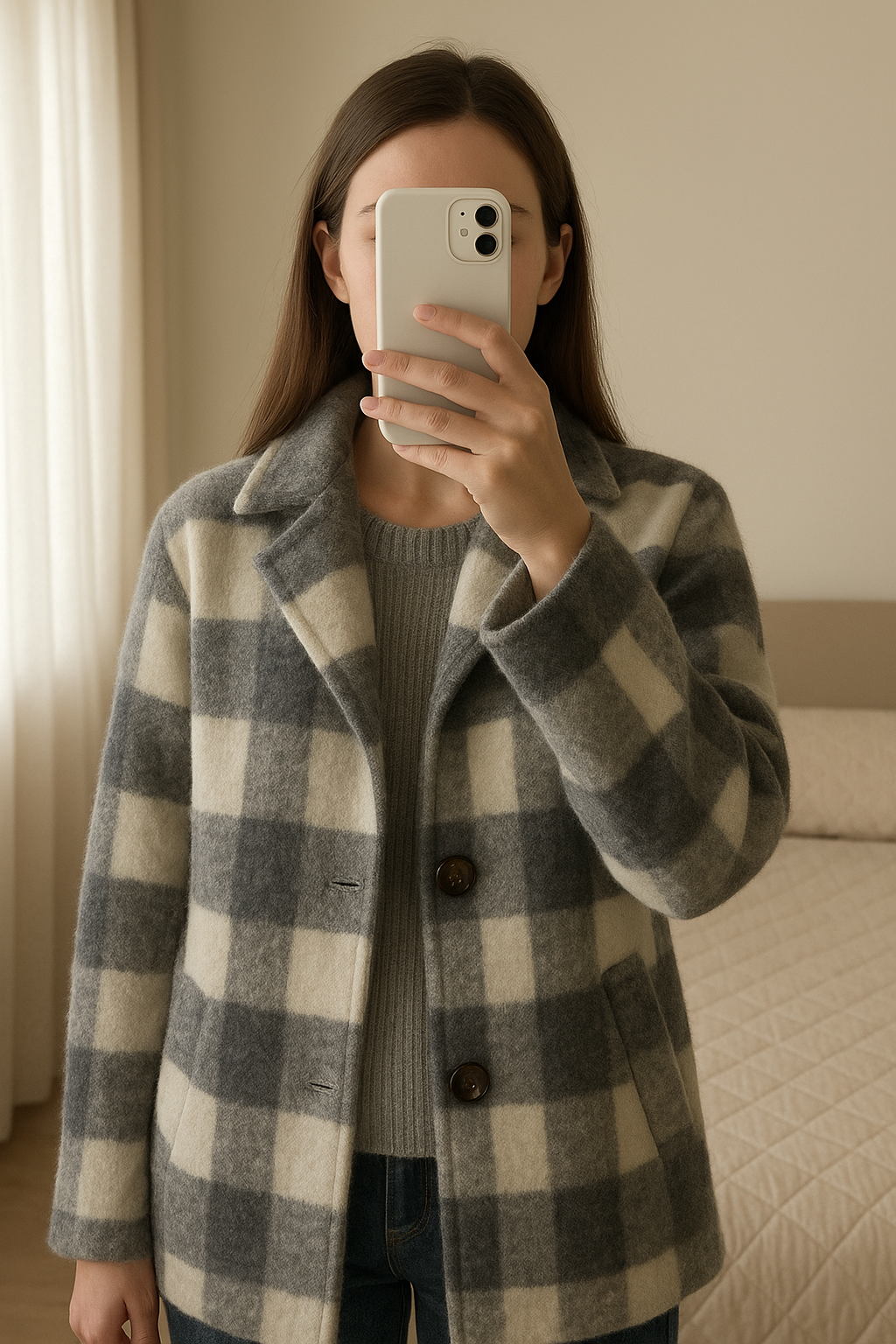 Veste manteau à carreaux – Taille M debout, face à la caméra, dans une chambre à la lumière douce, avec une lumière naturelle filtrant par la fenêtre.