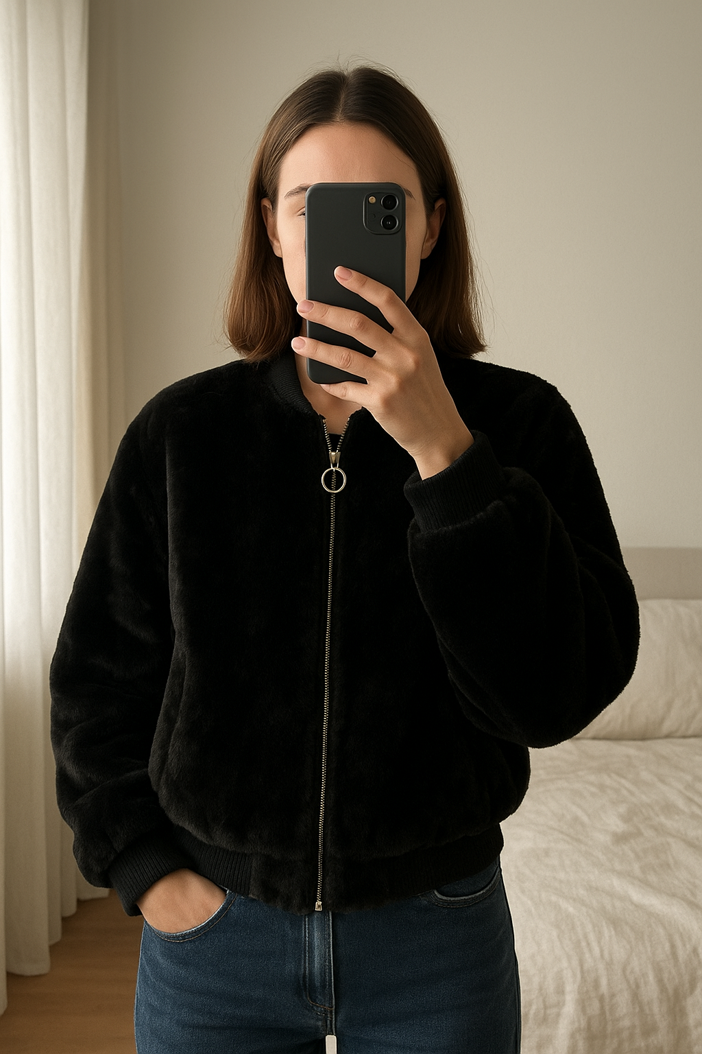 Veste mi-saison en fausse fourrure noire debout, face à la caméra, dans une chambre à la lumière douce, avec une lumière naturelle filtrant par la fenêtre.