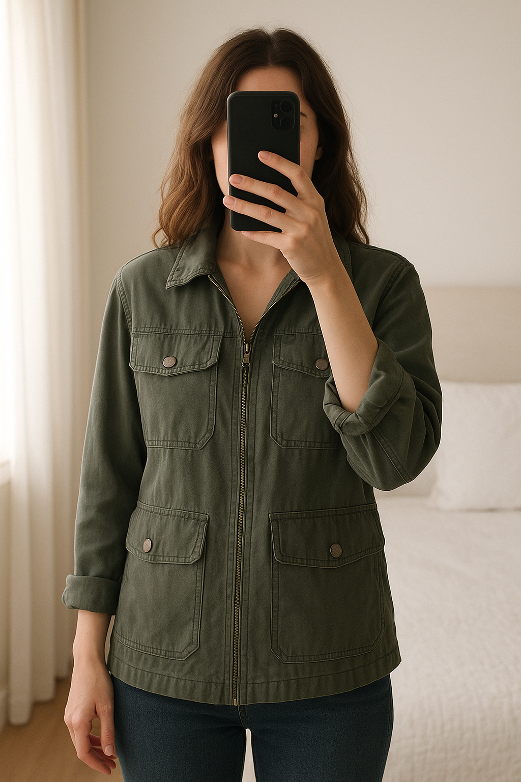 Veste militaire vintage kaki authentique debout, face à la caméra, dans une chambre à la lumière douce, avec une lumière naturelle filtrant par la fenêtre.