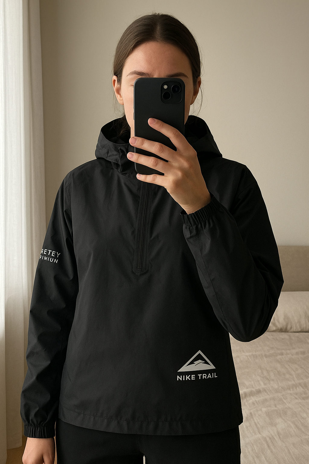 Veste Nike debout, face à la caméra, dans une chambre à la lumière douce, avec une lumière naturelle filtrant par la fenêtre.