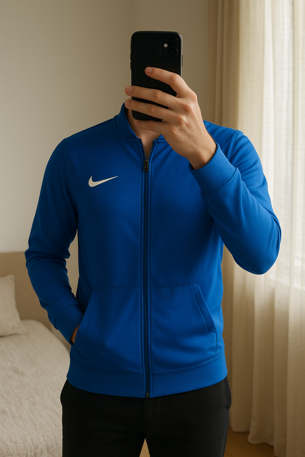 Veste Nike Dri-FIT – Bleu royal – Taille M debout, face à la caméra, dans une chambre à la lumière douce, avec une lumière naturelle filtrant par la fenêtre.