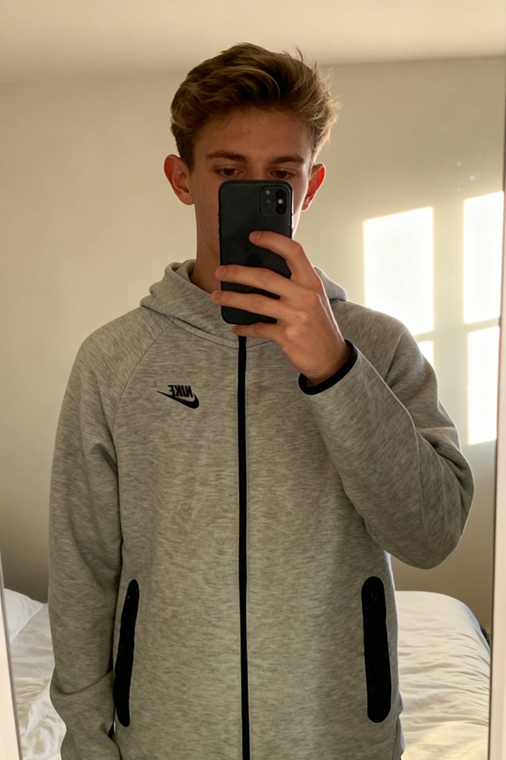 Veste Nike Tech grise debout, face à la caméra, dans une chambre à la lumière douce, avec une lumière naturelle filtrant par la fenêtre.