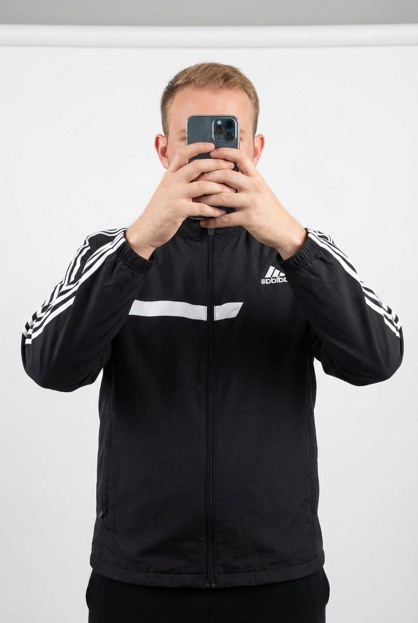 Une personne en Veste noire Adidas vintage, logo brodé blanc, poches zippées - Taille S debout, face à la caméra, avec une silhouette légèrement plus ronde, dans un studio photo épuré avec fond blanc et éclairage doux.