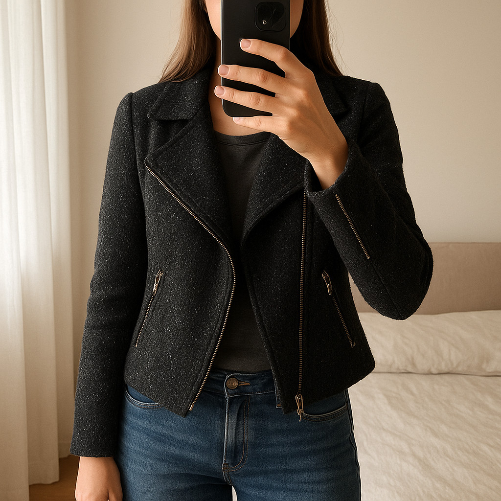 Veste noire femme S - Giacca Donna S in piedi, rivolto verso la fotocamera, in una camera da letto con luce soffusa e luce naturale che filtra dalla finestra.