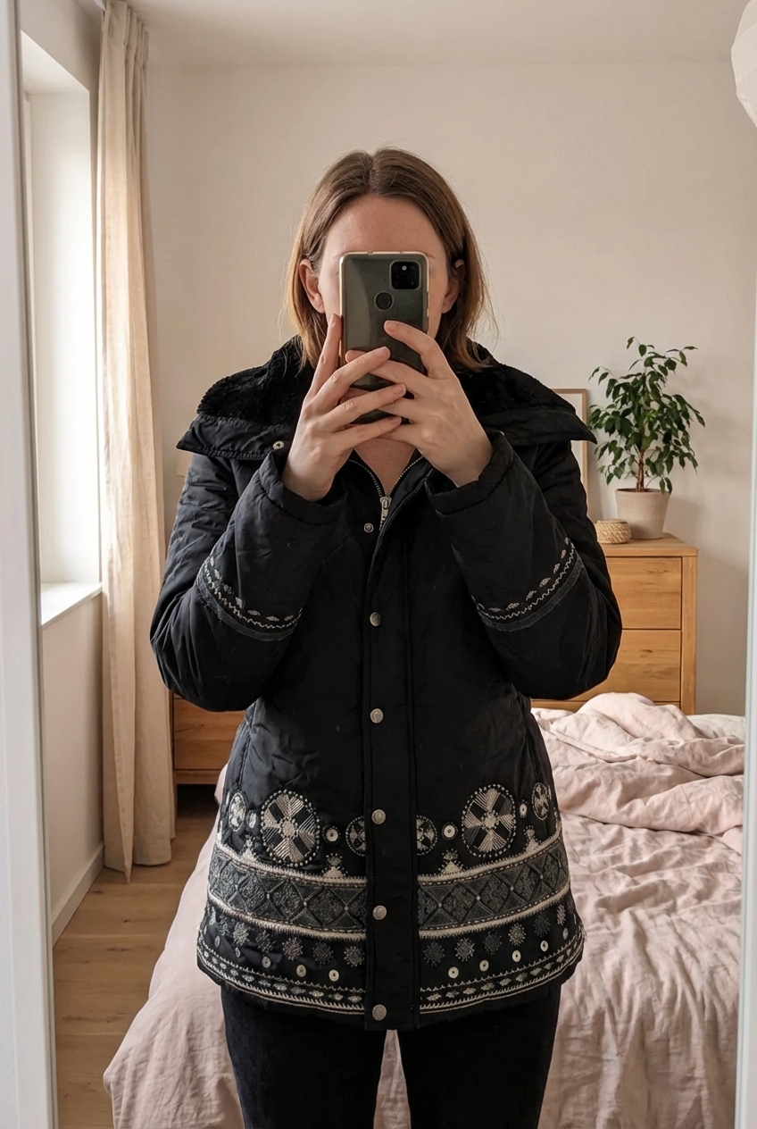 Veste Parka Deby Winter Fashion debout, face à la caméra, dans une chambre à la lumière douce, avec une lumière naturelle filtrant par la fenêtre.