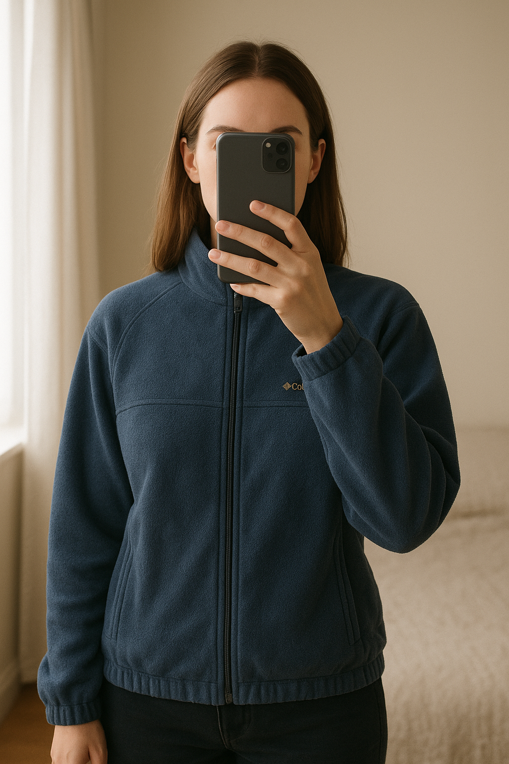 Veste polaire Columbia marine taille M debout, face à la caméra, dans une chambre à la lumière douce, avec une lumière naturelle filtrant par la fenêtre.