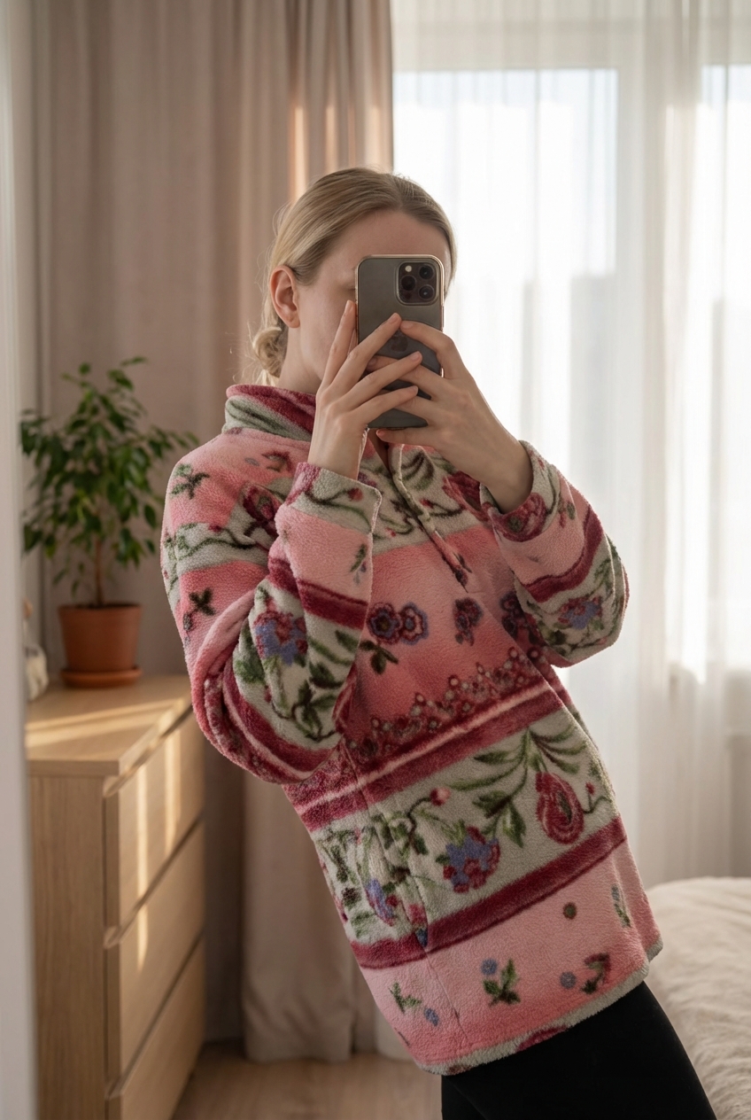 Une personne en Veste Polaire Crazy Fleece Vintage Y2K Flower patern Rose M cambrant légèrement le dos pour une pose dynamique, dans une chambre à la lumière douce, avec une lumière naturelle filtrant par la fenêtre.
